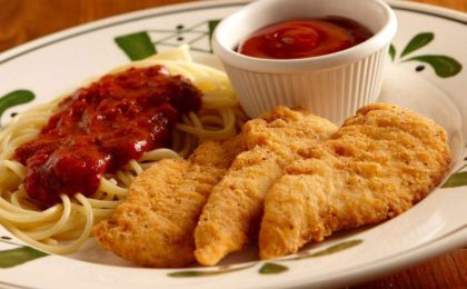Kids favorites, but adults like ’em too. Spaghetti in tomato sauce with sausage, chicken fingers, and mac ‘n cheese.