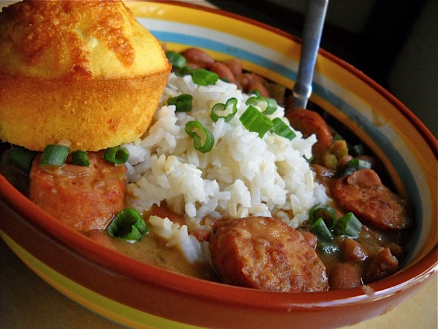 We’re trying out a recipe that Biker John swears is the best red beans and rice outside of Nawlins. Cornbread will round out your plate.